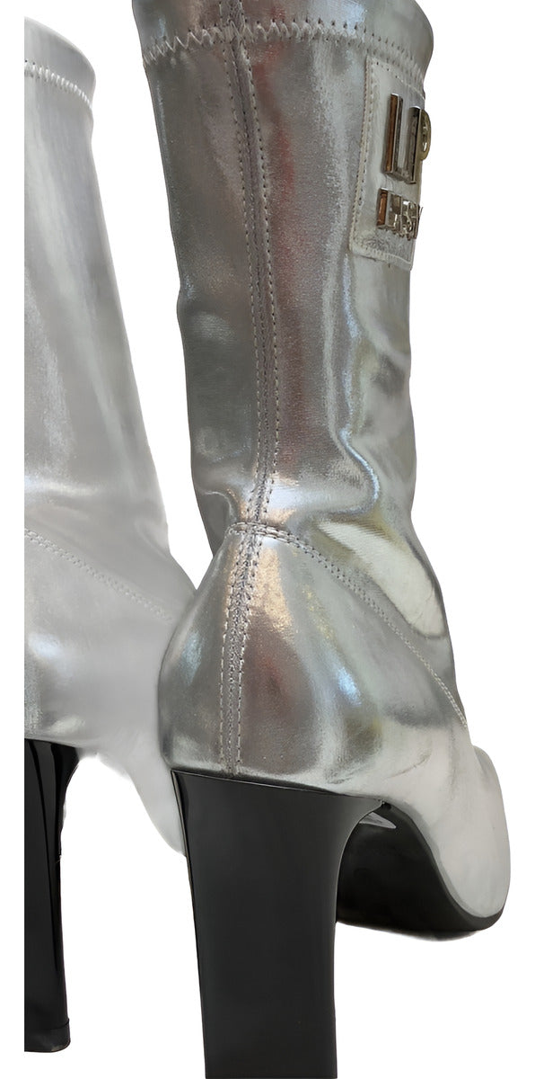 Bota Em Tecido Prateada Salto Alto Lança Perfume